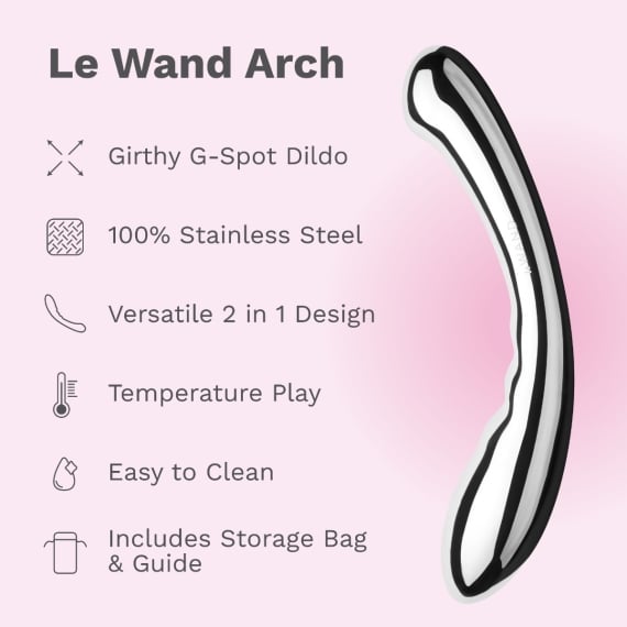 Indulge in rolling climaxes and experience endless gratification with the Le Wand Arch. The crescent-shaped, double-ended shape of this stainless steel wand is created for next-level G-spot stimulation. Glide the Arch into place, press it against your G-spot and let this double-ended pleasure tool send you into orgasmic bliss. Choose between the rippled bulbous end for a delightfully satisfying G-spot massage or the opposite end which boasts a flattened tip for targeted G-spot stimulation.
